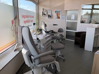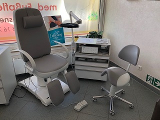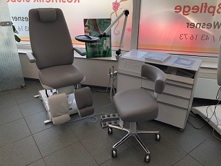 Behandlungsstuhl Concept F3, Gerlach Fußpflegeschrank Jupiter Duomatic S2 mit UV-Fach, Waldmann LED Ringlupenleuchte, Pending Arbeitsstuhl Ponso1
